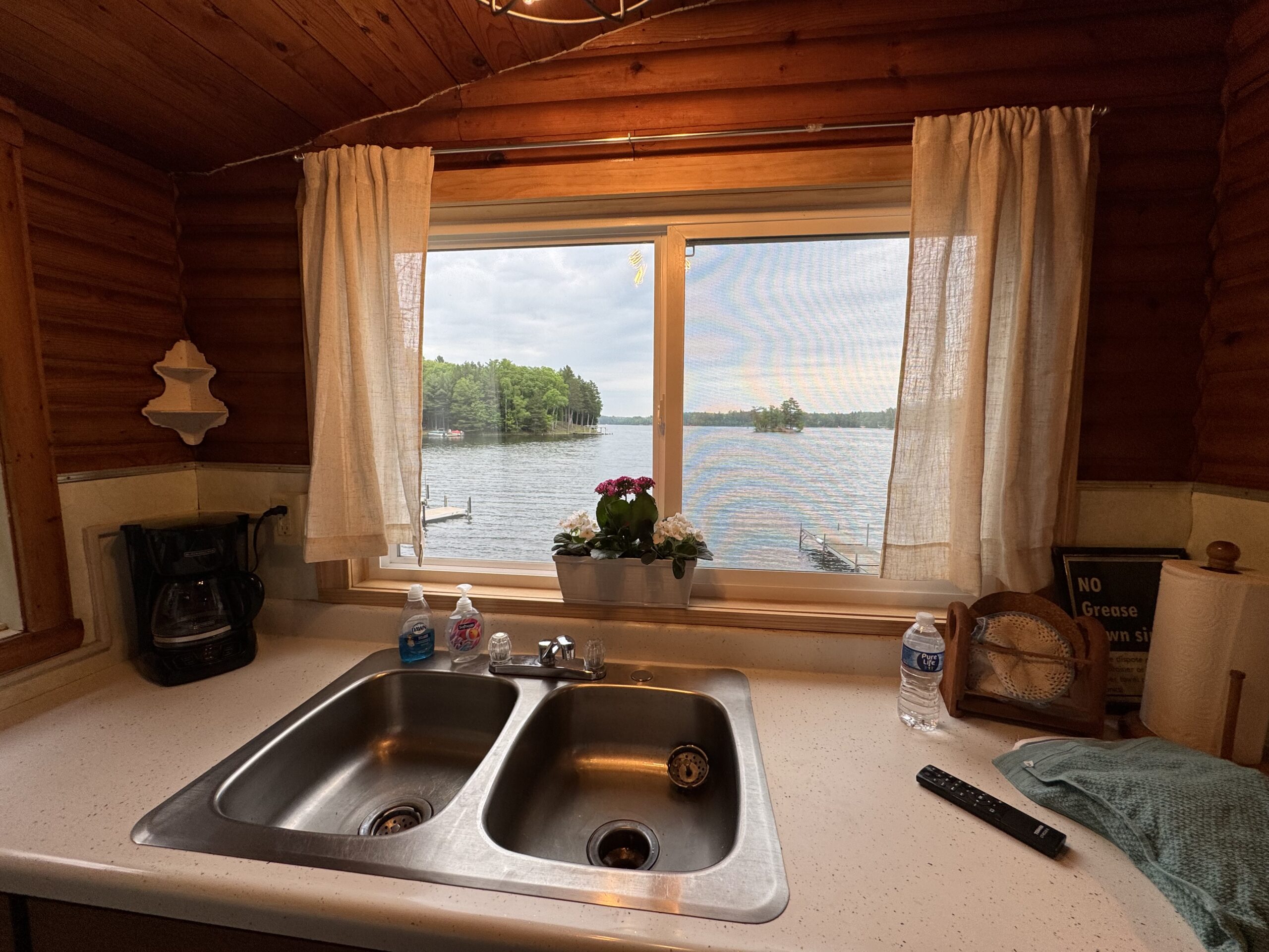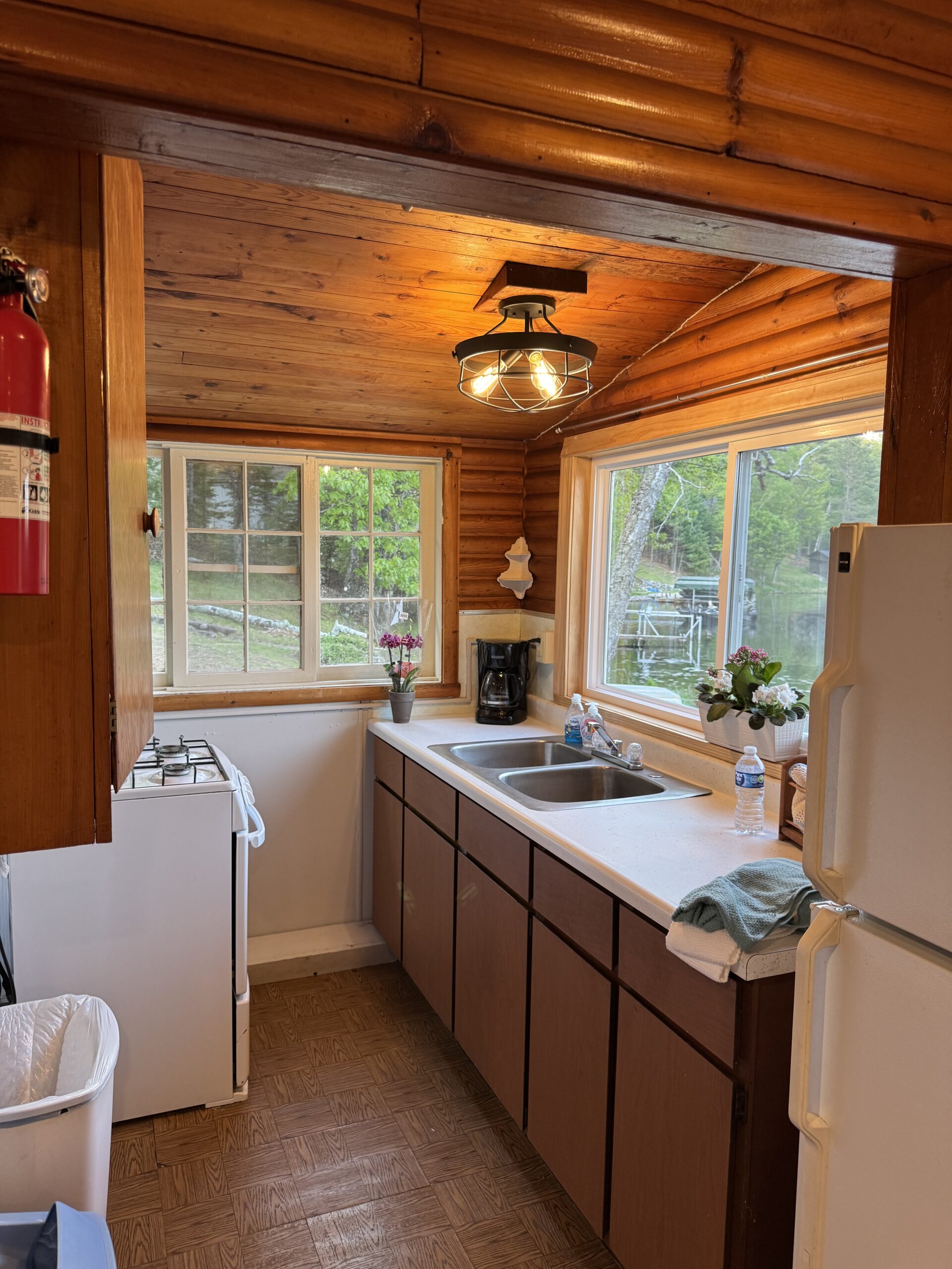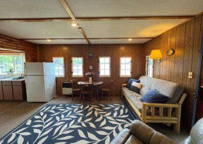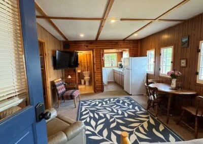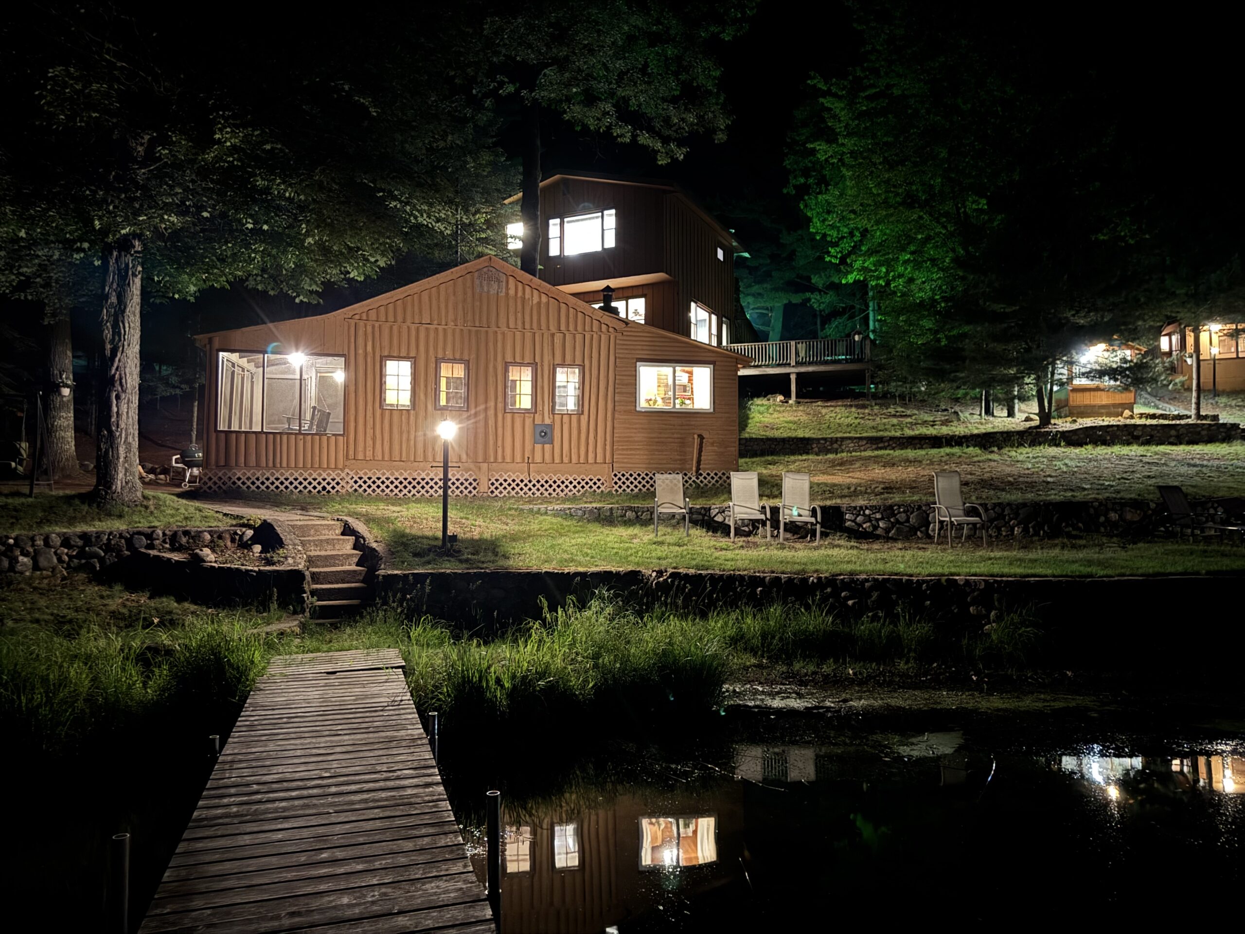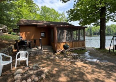 Our Lower Pine lakeside cottage has two bedrooms (double size beds), a private bathroom with full tub and shower, screened porch, campfire pit, and fully equipped kitchen. As well as an open living room with a table and 50” 4K Smart TV.